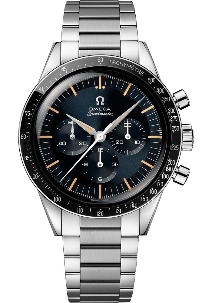 39.7 mm steel case with anti-magnetic protection, bezel ring is presented in black aluminium and includes the legendary tachymeter scale with an emblematic “Dot Over Ninety”, hesalite-like form scratch-resistant sapphire crystal with anti-reflective treatment inside, grey-blue dial, Omega 3861 manual-winding chronometer movement, approximately 50 hours of power reserve, flat links bracelet with OMEGA’s patented comfort release adjustment system. Water resistant to 50 metres (167 feet).